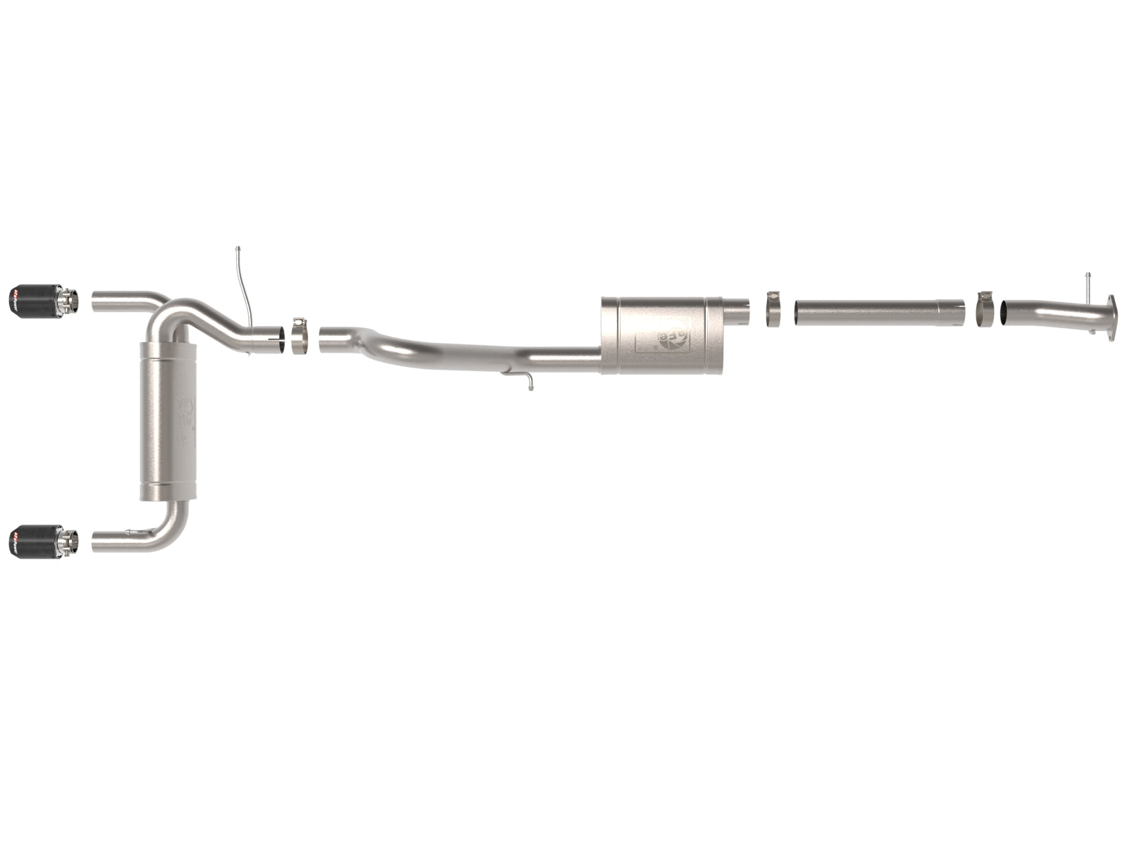 This cat-back exhaust system is constructed of 3 IN - 2-1/2 IN mandrel-bent 304 stainless steel tubing for maximum strength and durability. This system features high-flow 304 stainless steel mufflers, producing a mild sound. Finishing off this exhaust system are dual 4 IN diameter carbon fiber 304 stainless steel clamp-on exhaust tips. The tips features an aFe POWER logo for a unique style.This system produces a mild sound unleashing all available horsepower and torque. Utilizing a factory style flange and hangers this system is a direct bolt-on system, which requires no cutting or modifications for a hassle-free installation. State-of-the-art computer-aided design technology is utilized for precise vehicle fitment. 100% MIG-Welded for race-proven strength and durability.