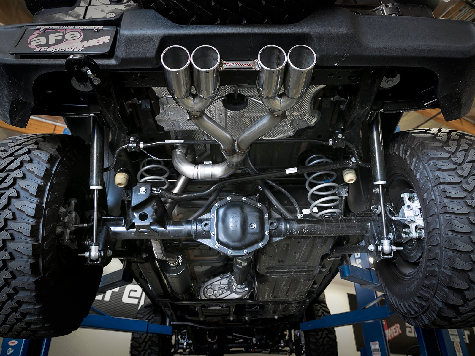 Unique sound and style is what this Rebel Series cat-back exhaust system delivers. 2 1/2" mandrel bent, 304 stainless steel tubing is 100% hand MIG-welded for race proven strength and durability. A high flow stainless steel, muffler delivers a powerful exhaust tone. The system uses factory mounting locations for an easy install that stays put under any driving condition. Finished with rear exit, quad 3 ½" diameter, stainless steel tips with our signature laser-cut aFe POWER badge for a unique, custom-styled look. 2-1/2" mandrel bent, 304 stainless steel tubing is less restrictive than stock. This allows maximum flow and low turbulence for increased torque, horsepower and improved throttle respons e. A primary, free-flowing stainless steel muffler absorbs the high pitch tones and balances exhaust pulses for a powerful exhaust note. Finished with high temp metallic black powder coating for the ultimate in corrosion resistance. Features a custom designed laser cut aFe logo tip brace with a bolt-on red powder coat backing plate to compliment the logo. This system is not compatible with factory receiver (tow hitch).